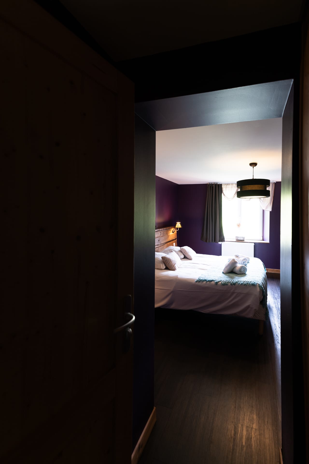 Cette chambre double (face aux « bauchés » en patois bressaud,comprenez la vieille porte de grange) aux nuances de prune, envoûte par son caractère romantique et reposant.